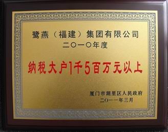 由廈門市湖里區(qū)政府舉辦的 “湖里區(qū)2010年度納稅先進(jìn)企業(yè)”的評選名單已經(jīng)正式揭曉,鷺燕(福建)集團(tuán)有限公司榜上有名,獲得了 “湖里區(qū)2010年度納稅大戶1千5百萬元以上先進(jìn)企業(yè)”的榮譽(yù)稱號。自2007年底搬遷至湖里區(qū)以來,我司已連續(xù)三年獲此榮譽(yù)稱號。