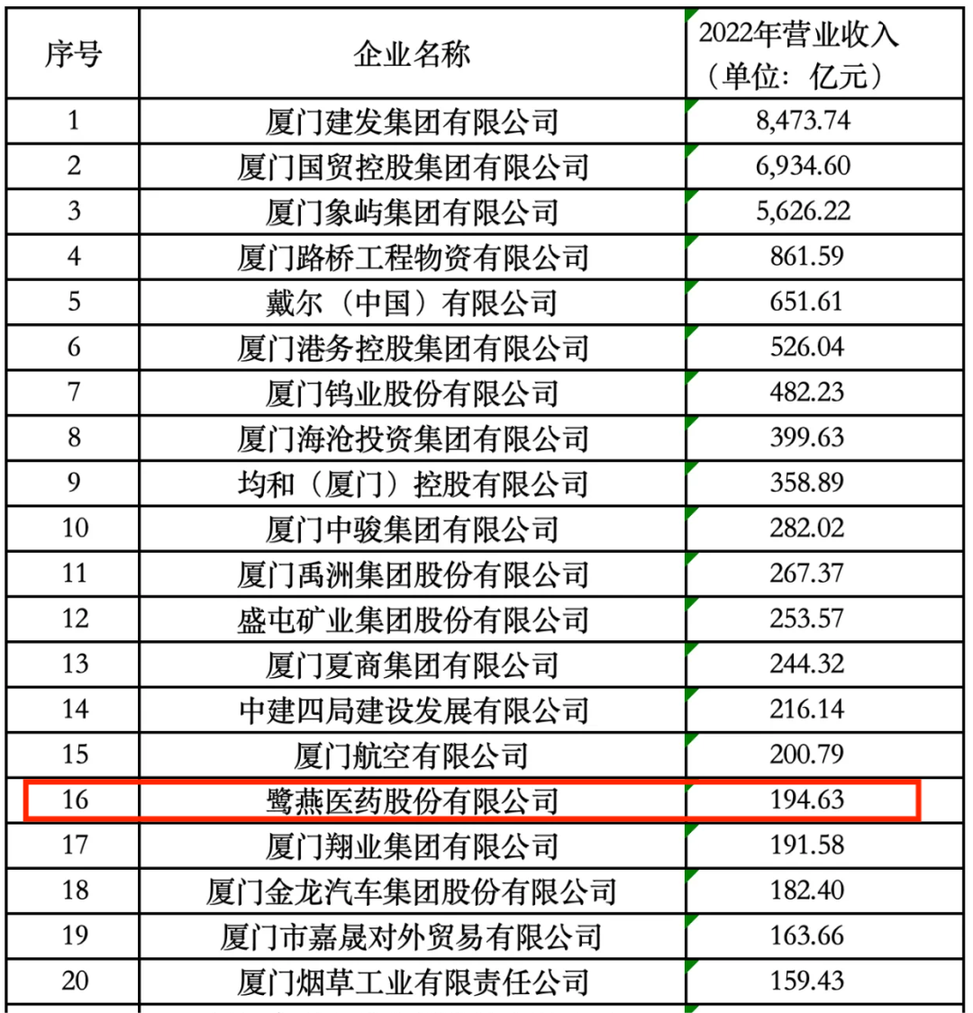 2023年11月25日,廈門企業(yè)和企業(yè)家聯(lián)合會(huì)發(fā)布2023廈門企業(yè)百強(qiáng)榜單,鷺燕醫(yī)藥股份有限公司榮列第16位!