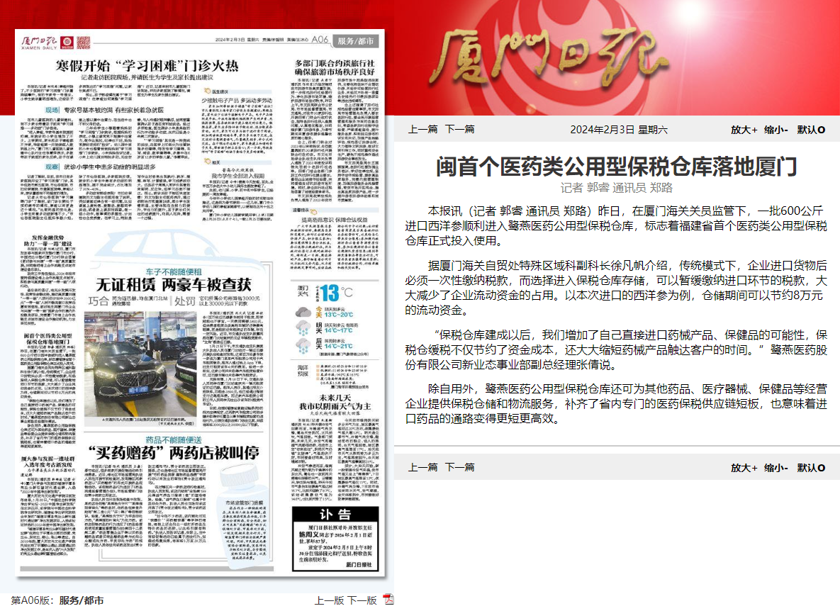 2024年2月2日,鷺燕醫(yī)藥公用型保稅倉獲批投用,《福建日報(bào)》《廈門日報(bào)》相繼報(bào)道相關(guān)新聞。鷺燕醫(yī)藥公用型保稅倉是福建省首個(gè)醫(yī)藥類公用型保稅倉庫,該保稅倉庫的投用,意味著廈門市乃至福建省補(bǔ)齊了區(qū)域內(nèi)專門的醫(yī)藥保稅供應(yīng)鏈物流服務(wù),也意味著廈門和福建進(jìn)口藥品的通路變得更短,更為高效。