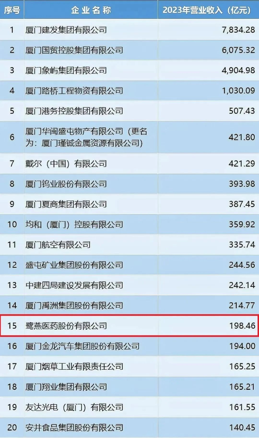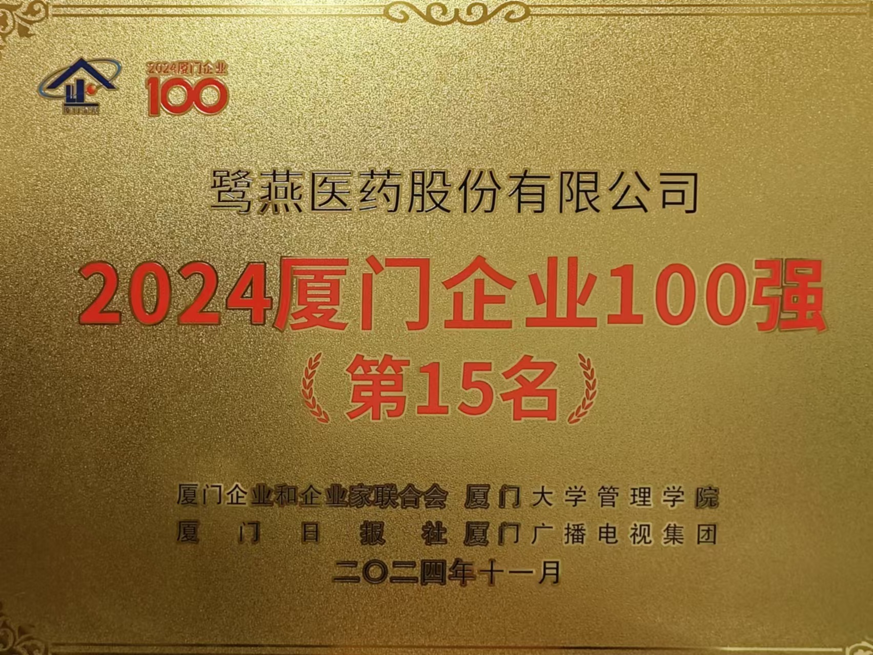 2024年11月,廈門(mén)企業(yè)和企業(yè)家聯(lián)合會(huì)發(fā)布2024廈門(mén)企業(yè)百?gòu)?qiáng)榜單,鷺燕醫(yī)藥股份有限公司榮列第15位!