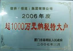 2007年3月9日,廈門市思明區(qū)在國際會展中心召開2006年度納稅大戶表彰大會,鷺燕(福建)集團(tuán)喜獲“2006年度超1000萬元納稅特大戶”榮譽(yù)稱號。